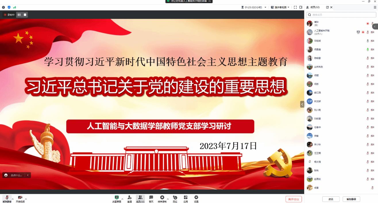为深入开展学习贯彻习近平新时代中国特色社会主义思想主题教育,7月17日,人工智能与大数据学部教师党支部召开党员大会,会议由学部党总支副书记(负责工作)王星捷主持,支部全体党员参加,采用线上线下混合会议。