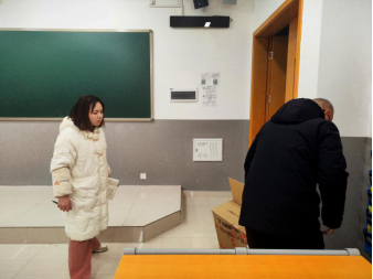 曾安平、解启娜对6号楼教室的座椅板凳、黑板等设施进行安全检查。