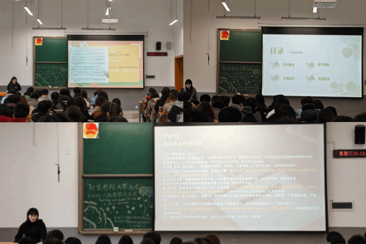 首先登场的肖婷同学系统性地从词汇、听力、阅读、写作四个维度展开讲解,特别强调了科学规划和持之以恒的理念。建议备考期间可以每天固定时间进行专项训练,并配合全真模拟。最后还贴心地推荐了四、六级核心词汇等实用备考资料。随后分享的刘念同学则聚焦真题训练的重要性。强调自己从反复的真题训练中整理出了一些规律,并总结了一套高效的解题技巧。最后出场的马明月同学针对写作和翻译这一难点进行深入剖析。强调了积累、总结和背诵好范文的重要性,通过对比不同分数段的范文,她直观展示了高分作文的必备要素。此外,她还分享了自己整理的复习资料等,让同学们受益匪浅。