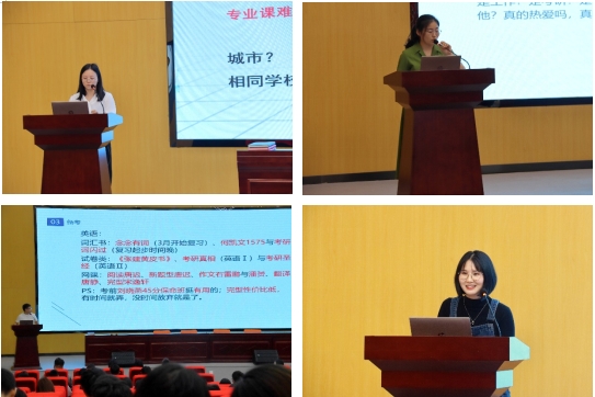 分享会开始,王琳和明自东就考研如何合理选择院校和专业、如何规划学习计划、如何安排复习时间进行了详细的讲解,并且介绍了考研专业课的相关情况,同时作为四川省优秀毕业生,王琳也给在座的师弟师妹们就“如何有意义的度过老员工涯”给出了中肯的建议,鼓励师弟师妹们认真学习,不断提升自己的专业技能;王曼婷从自身角度出发,详细的分享了跨专业考研的经验,谢雨欣将自己考研路上的遇到问题和同学们分享,希望同学们少走弯路,保持良好的心态,为自己的梦想努力奋斗。