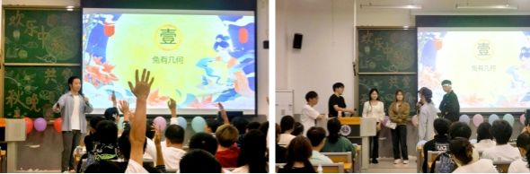 随后,开展了三轮有关中秋的游戏:兔有几何、话中秋和月问。同学们踊跃参与,游戏场面欢快且充满笑声。其中,猜字谜环节备受欢迎,大家积极思考字谜的答案。