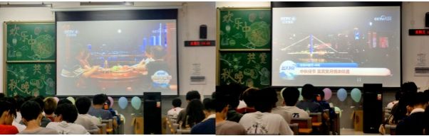第一个环节所有师生一起观看央视中秋晚会,晚会中美轮美奂的舞台、水天一色的场景、精彩绝伦的演出以及央视中秋晚会拍摄地四川宜宾的一些特色景观、美食等吸引了所有人的视线。