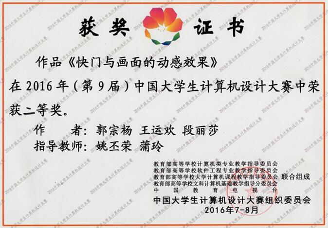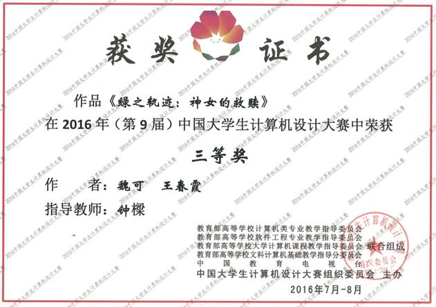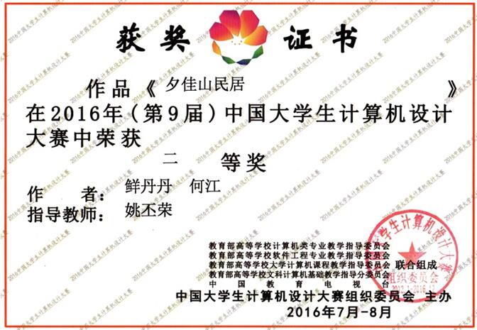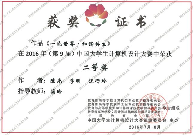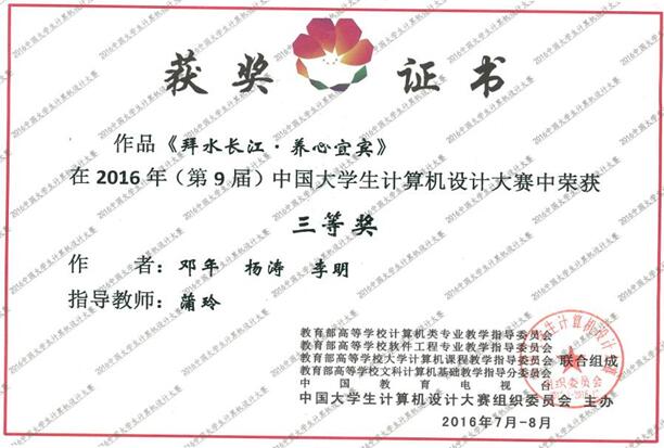 2016年(第9届)中国老员工计算机设计大赛共有约500所院校组织约6000件作品参加。经全国各省级赛区选拔推荐,共有2320件作品入围决赛。自2016年7月23日至8月26日分别在合肥、北京、厦门、南京、宁波、上海赛区分类别举行了现场决赛,最后评出一等奖作品137件、二等奖作品763件、三等奖作品1133件、优胜奖作品34件,获奖作品共计2067件。太阳成集团tyc33455cc在全国总决赛中荣获全国二等奖3项,全国三等奖3项,其中,蒲玲老师指导的《一色世界·和谐共生》(来源:太阳成集团tyc33455cc陈光、李明、汪巧玲)获得全国二等奖,姚丕荣老师指导的《夕佳山民居》(来源:太阳成集团tyc33455cc何江、鲜丹丹)获得全国二等奖,姚丕荣、蒲玲老师指导的《快门与画面的动感效果》(来源:太阳成集团tyc33455cc郭宗杨、王运欢、段丽莎)获得全国二等奖、钟樑老师指导的《绿之轨迹:神女的救赎》(来源:太阳成集团tyc33455cc魏可、王春霞)获得全国三等奖、蒲玲老师指导的《拜水长江·养心宜宾》(来源:太阳成集团tyc33455cc邓年、杨涛、李明)和《在路上》(来源:太阳成集团tyc33455cc杨涛、陈光、王双燕)获得全国三等奖。太阳成集团tyc33455cc获奖作品设计新颖,主题鲜明,工作量饱满,获得评审专家与其他参赛选手的一致认可与好评。