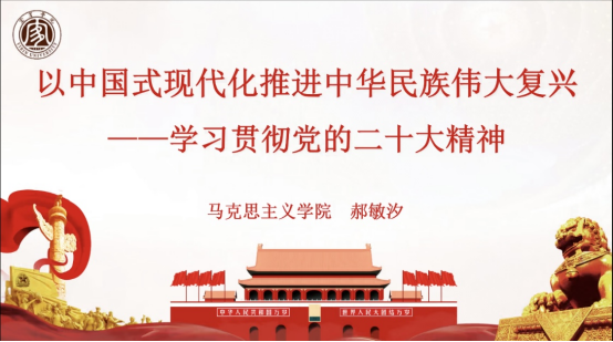 郝敏汐老师从党的二十大的5项议程、起草过程、15个组成部分和党的二十大主题等多方面论证了“继往开来:党的二十大会议是处于关键历史关口的一次重要大会”这一论断。赫老师结合四川省内实际情况,从深刻把握过去5年的工作和新时代10年的伟大变革、深刻把握开辟马克思主义中国化时代化新境界的历史责任、深刻把握以中国式现代化全面推进中华民族伟大复兴的使命任务等三个方面详细展开,全面深入地对党的二十大报告进行了剖析。