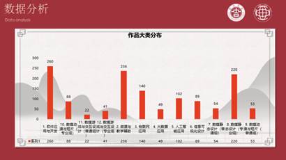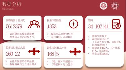 本次大赛共有46所本科院校、22所高职院校参赛,比赛作品1353件,其中本科院校作品1193件,高职院校作品160件。本次省级赛设12个奖项分类:(1)软件应用与开发;(2)微课与教学辅助;(3)物联网应用;(4)大数据应用;(5)人工智能应用;(6)信息可视化设计;(7)数媒静态设计(普通组);(8)数媒静态设计专业组;(9)数媒动漫与短片(普通组);(10)数媒动漫与短片专业组;(11)数媒游戏与交互设计(普通组);(12)数媒游戏与交互设计专业组。