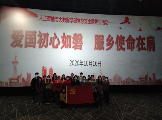 为进一步推进我部“五心”党支部建设,引领广大师生党员坚定理想信念,践行党员初心使命,10月16日,在第七个国家扶贫日到来之际,人工智能与大数据学部组织开展了“爱国初心如磐,服乡使命在肩”主题党日活动——集中观影爱国影片《我和我的家乡》。员工党支部书记林文娇老师、王利梅老师和宣传委员许炜萍老师带队,共计20余名员工党员参与了本次活动。